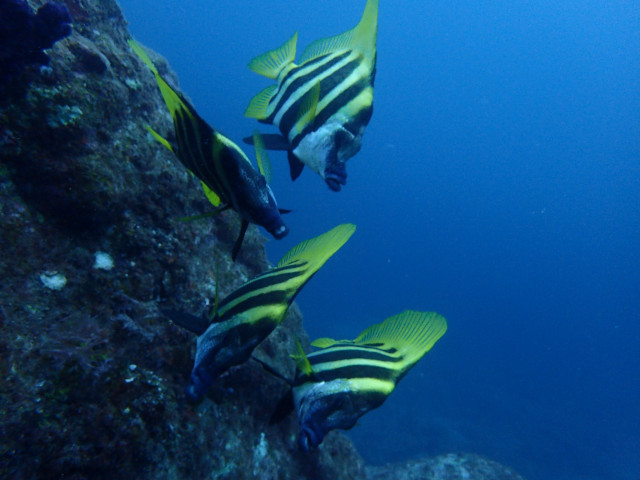 エンピツ岩で、オトヒメウミウシの交接中、漂うニザダイ、メアジの群れ。