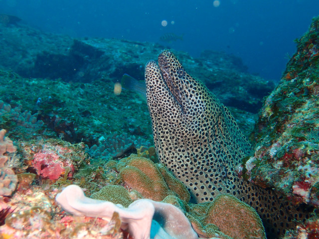 西の端の根の上で、大きなにニセゴイシウツボが顔を覗かせていた。