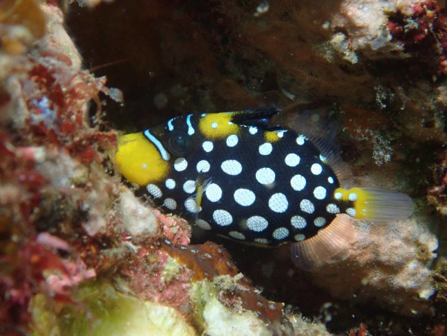 帰り道に経由した、通路岩ではモンガラカワハギの幼魚。