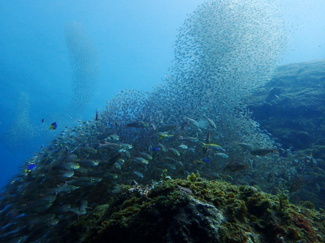 水深を10m程まで上げると、キビナゴの群れが表層にかけて群れていた。