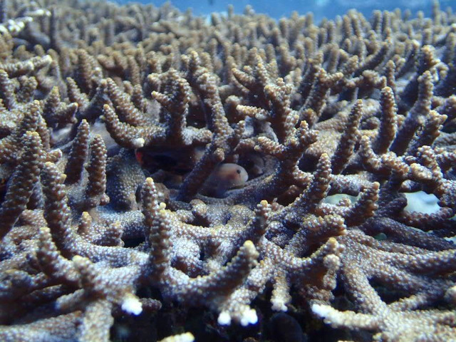 この棚の水深の浅い所はクシハダミドリイシだろうか、テーブルサンゴが沢山生育している。