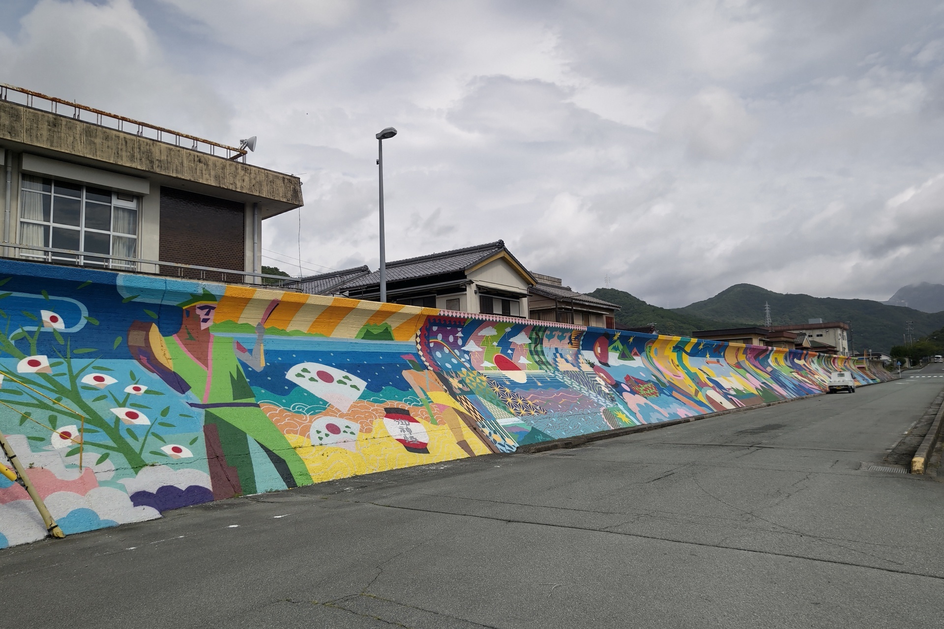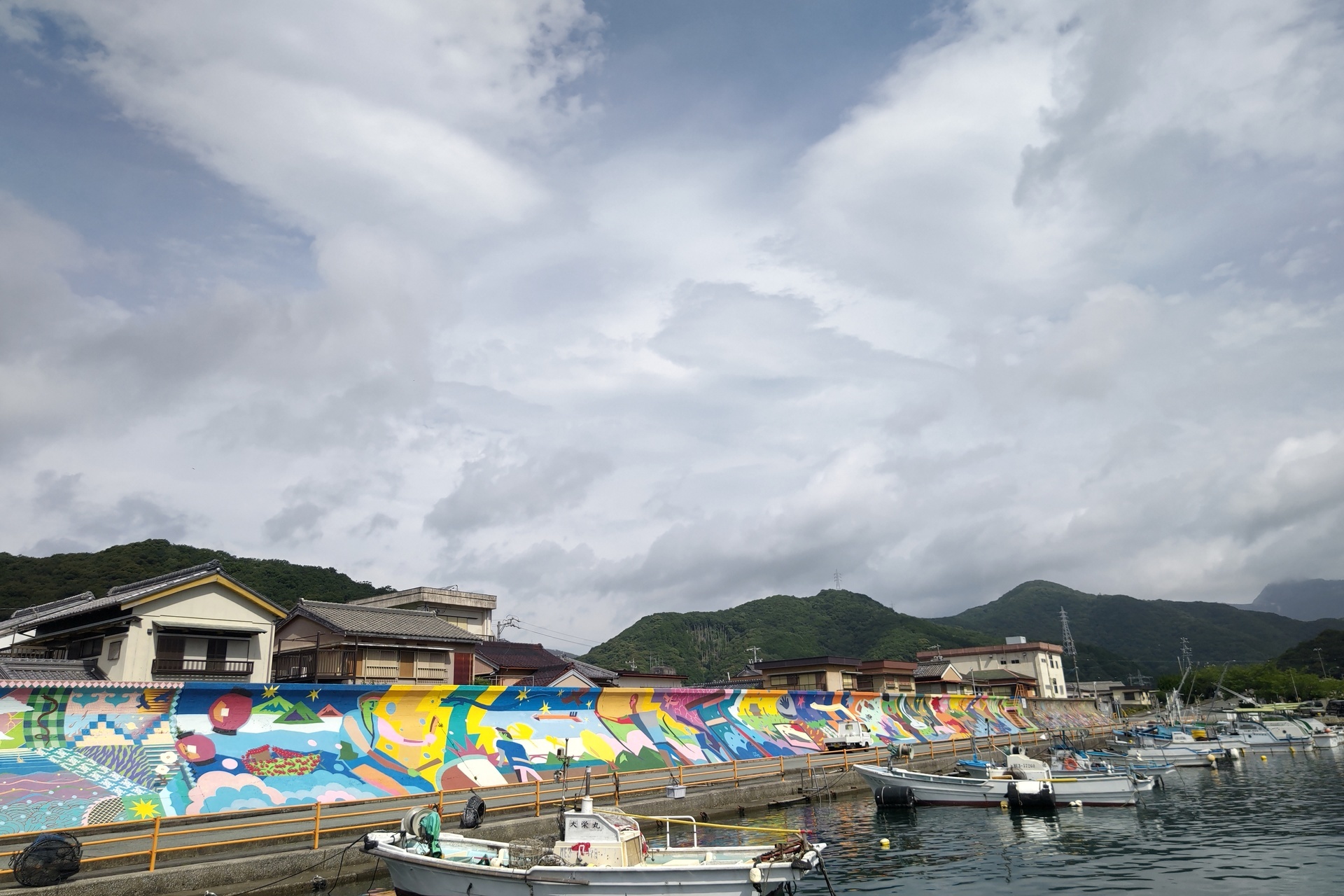 満潮の漁港に カラフルな防波壁の作品が、見ていて楽しかったです。