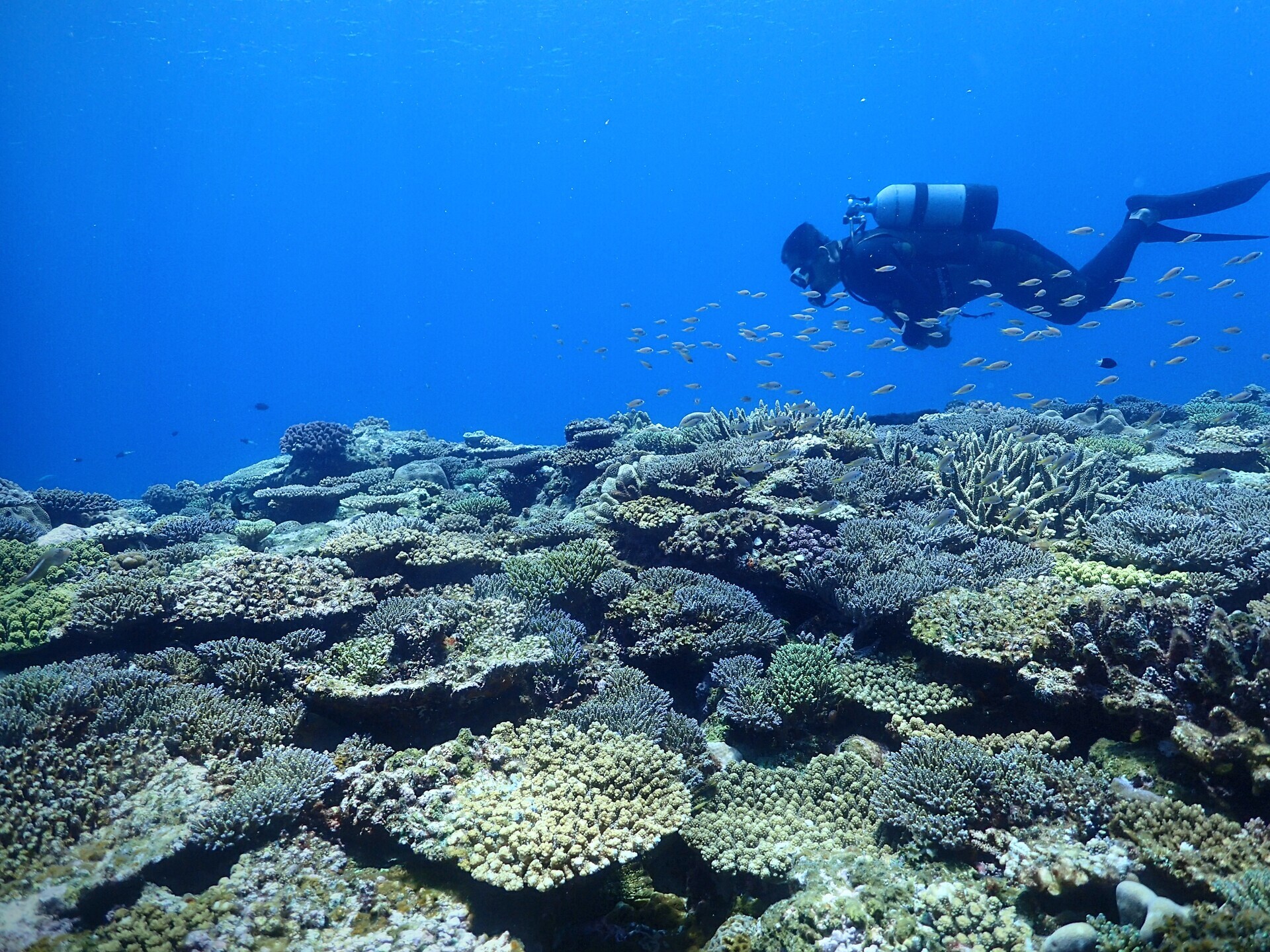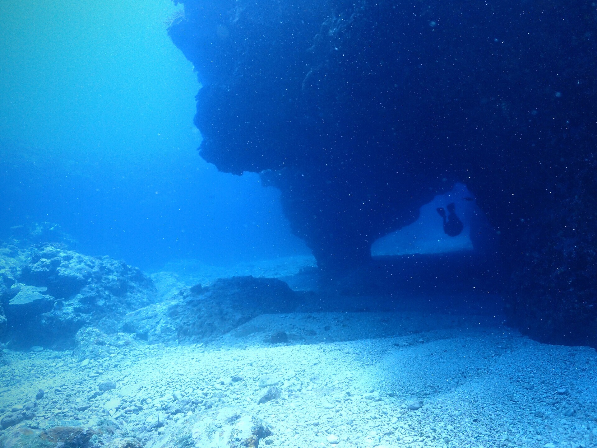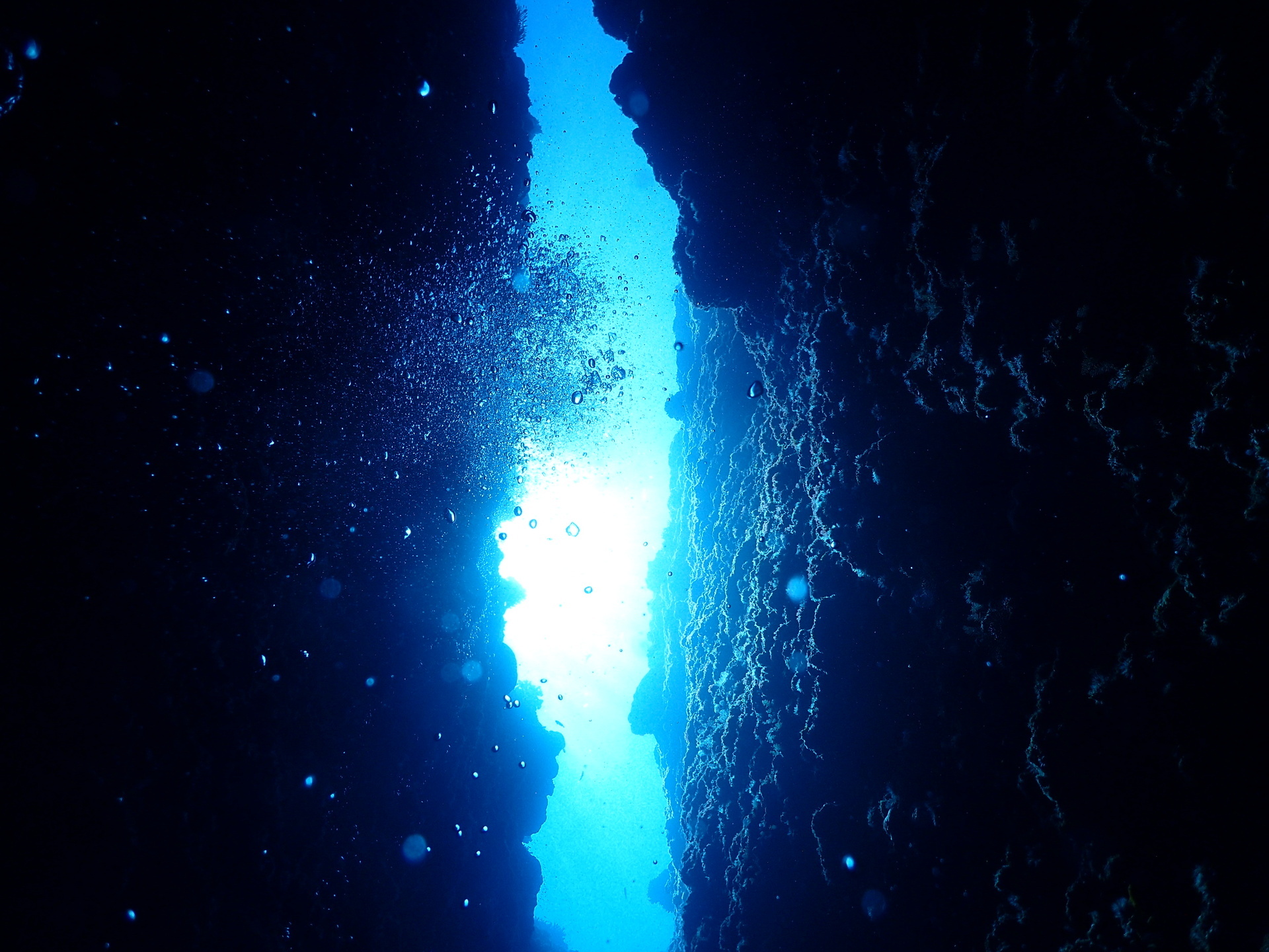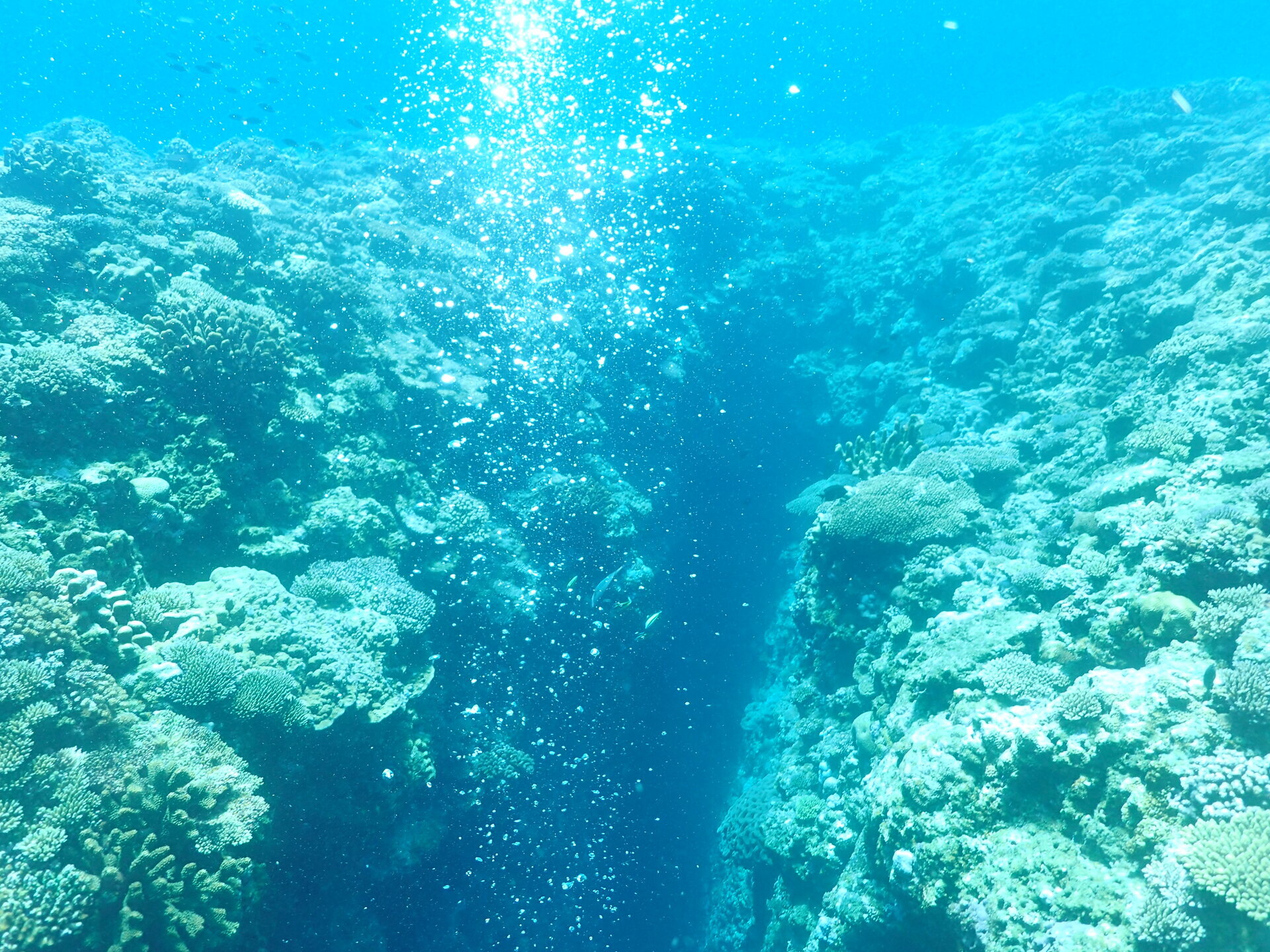 リーフに空いた縦穴を潜降していくと、リーフの外に出られる。