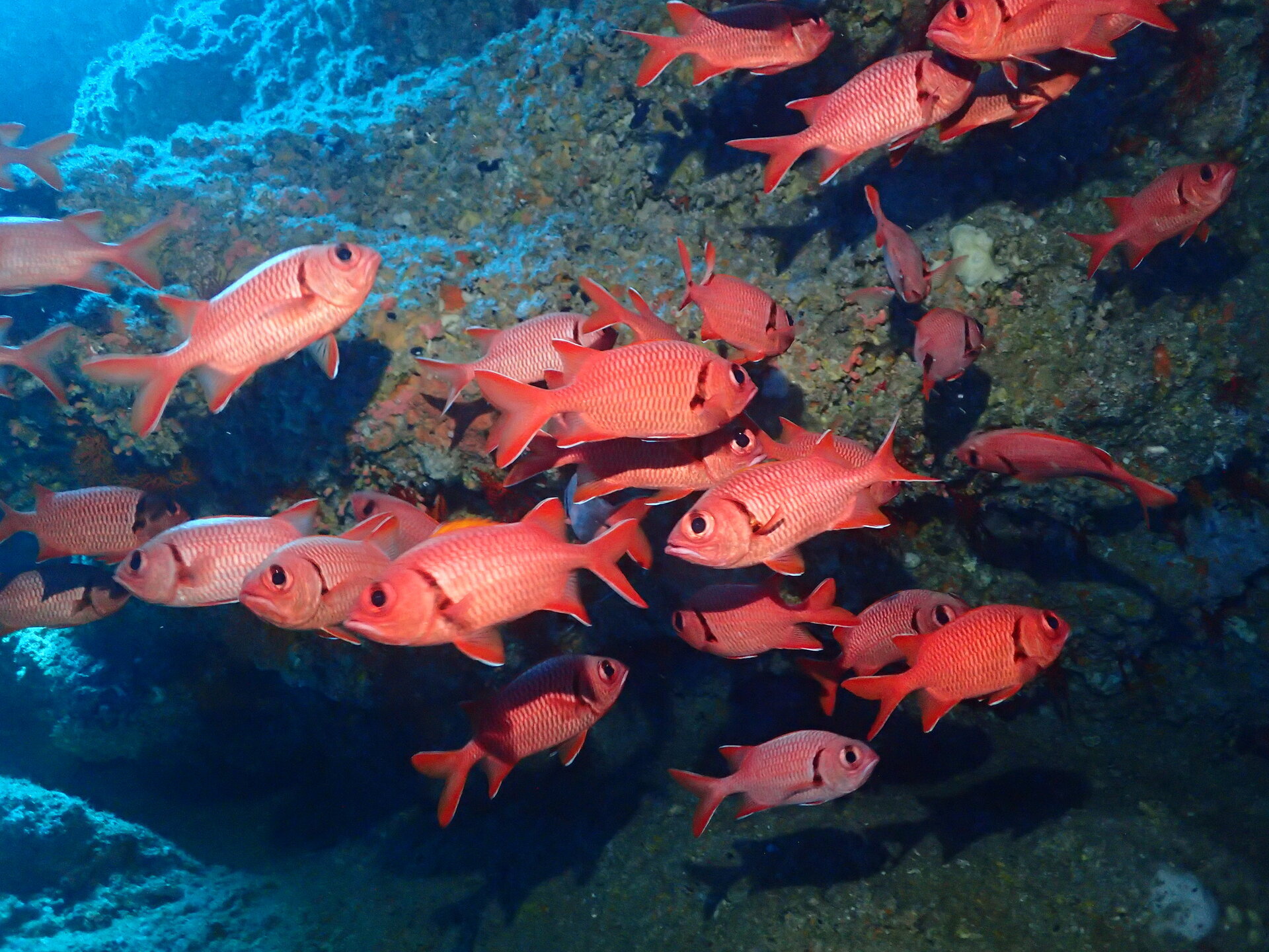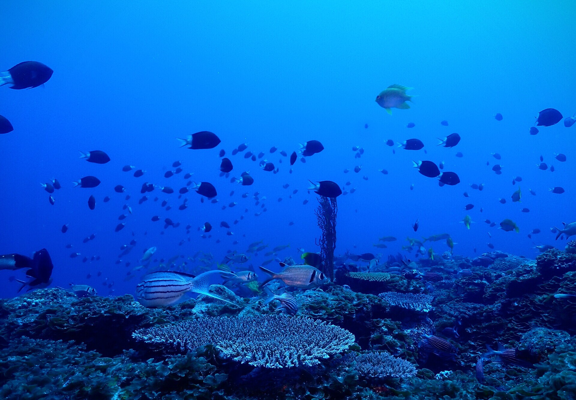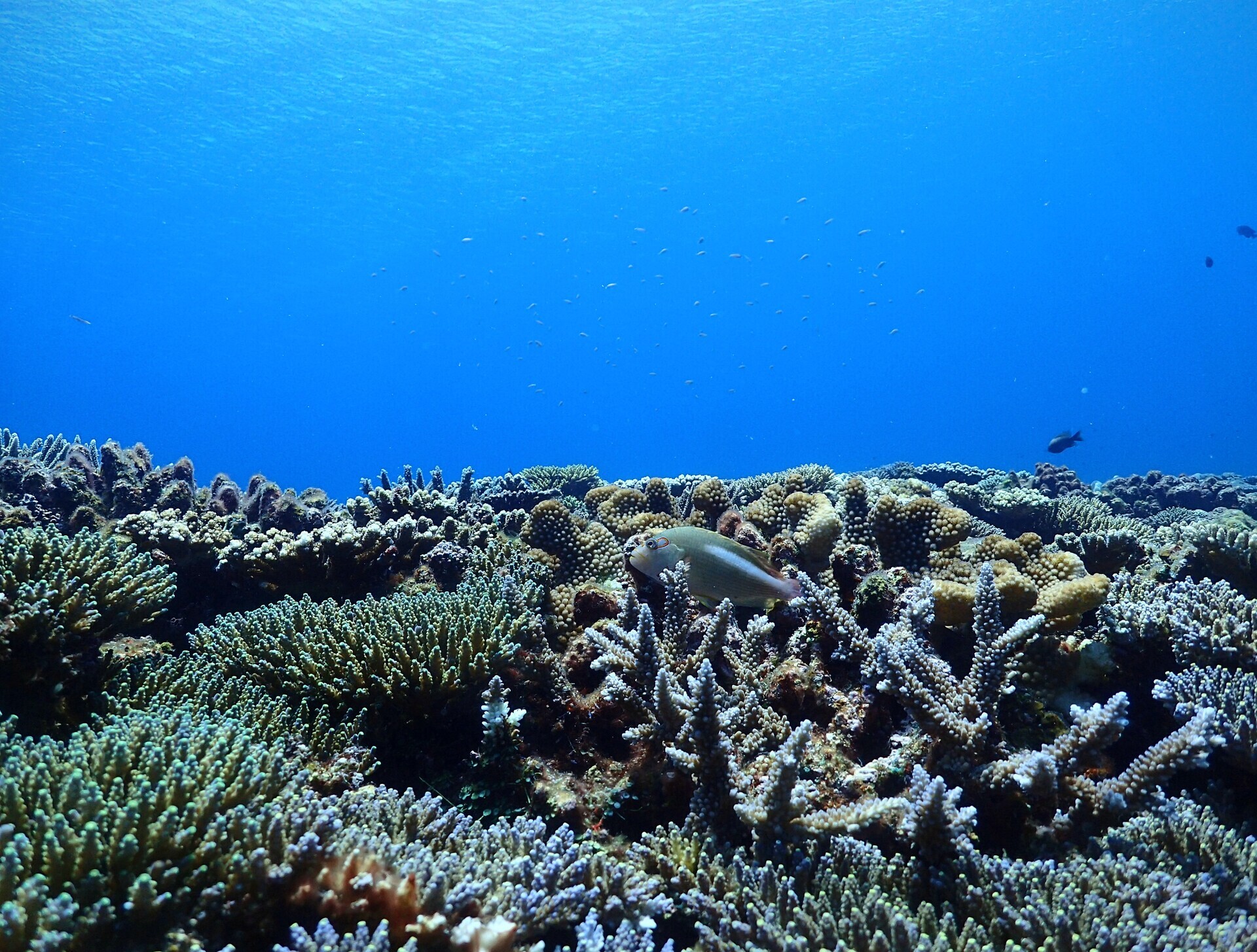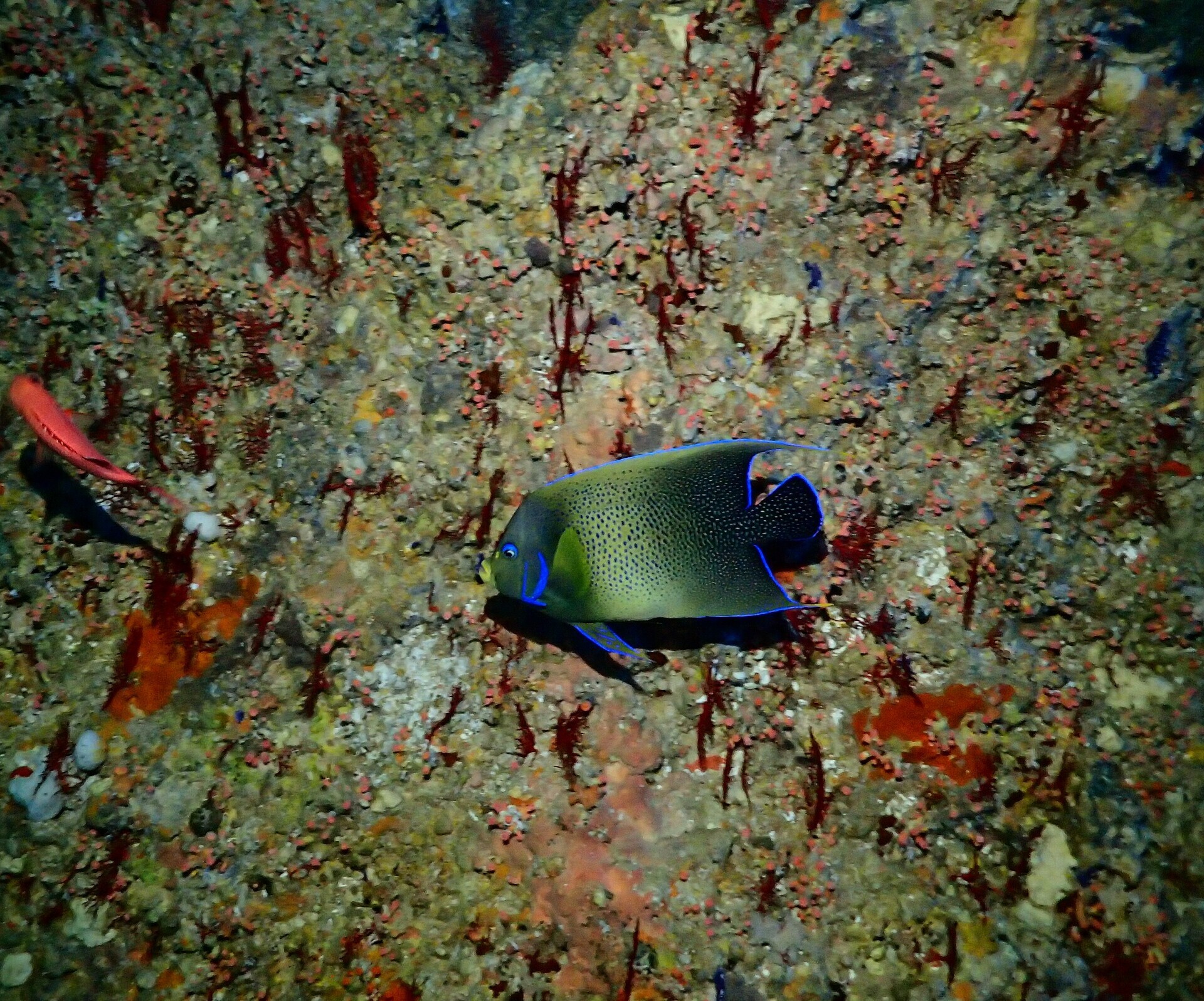リーフに空いた縦穴を潜降していくと、リーフの外に出られる。
