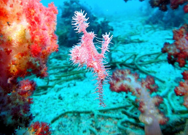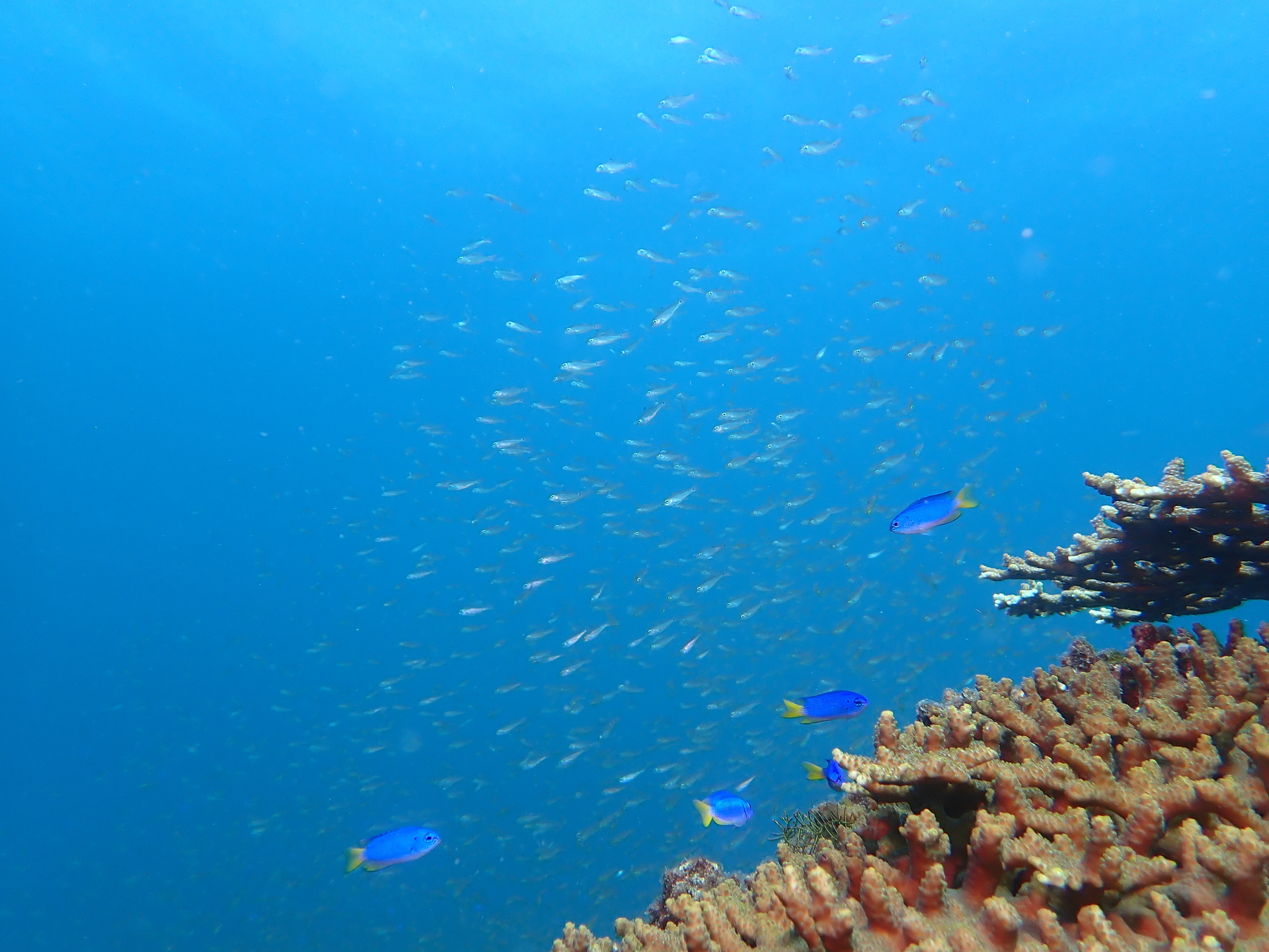 点在するサンゴと、澄んだ水の中を舞っているソラスズメダイ達だけでも、うっとりするような綺麗な光景。