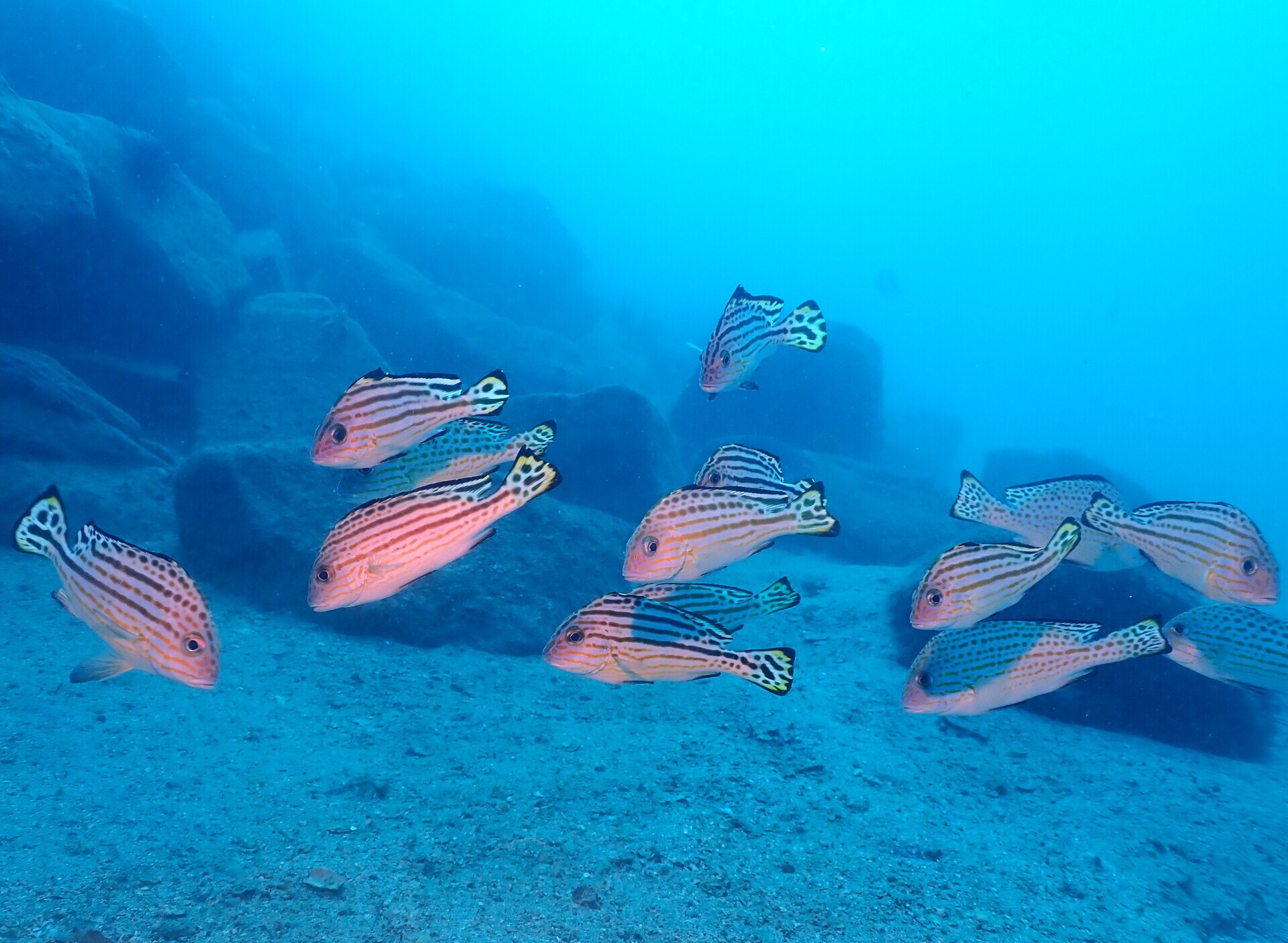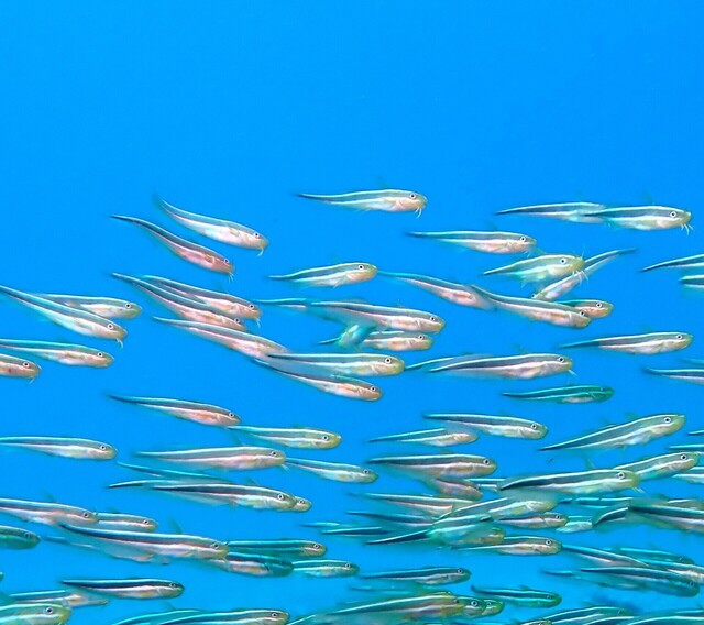 敷石エリアでは魚も多く、待望のメアジたちも。